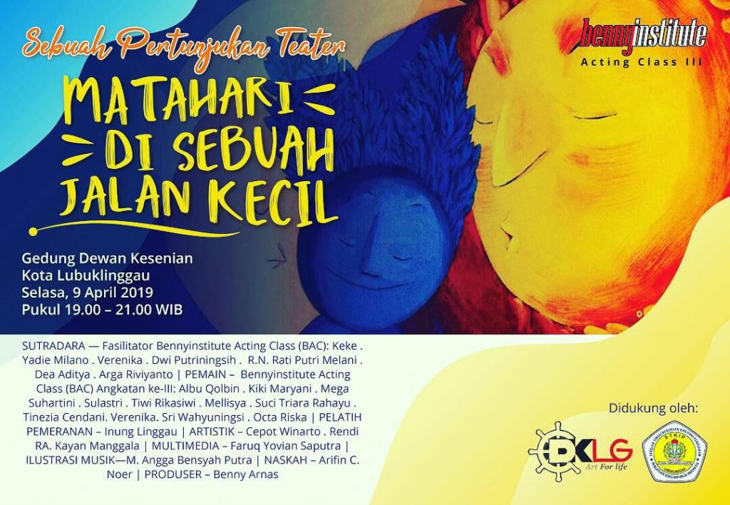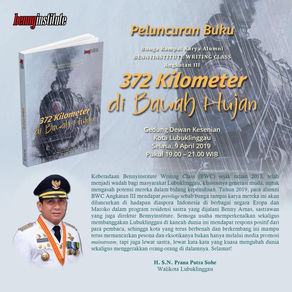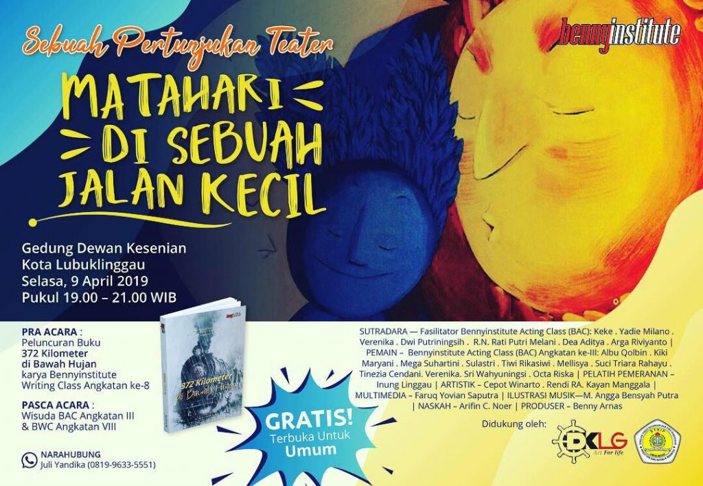 Malam wisuda yang sangat dinanti. Senyum bahagia nampak jelas menghiasi wajah para peserta Bennyinstitute Acting Class (BAC) dan Bennyinstitute Writing Class (BWC). Malam kemarin, 9 April 2019, pukul 19.00 WIB, para peserta BAC dan BWC angkatan 3 telah melaksanakan wisuda di Gedung Sekretariat Dewan Kesenian Kota Lubuklinggau.