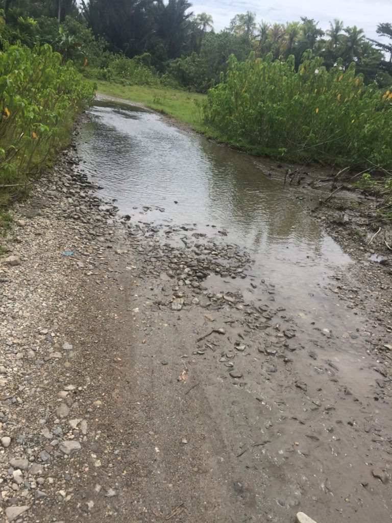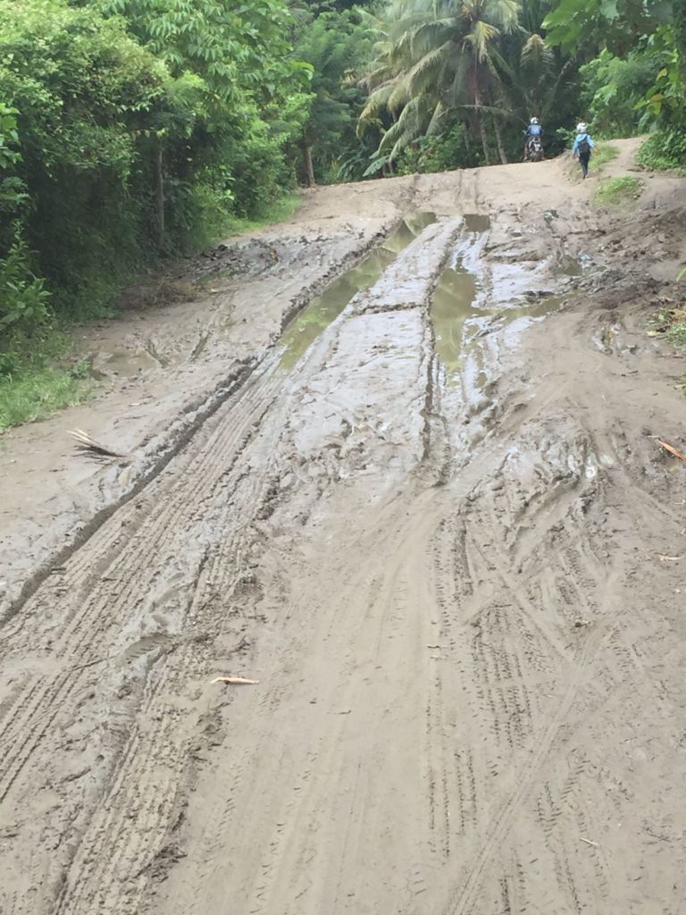 Laki-laki berkepala plontos itu benar. Baru saja kami melewati kali baru, jalanan berlubang di sana-sini sudah menyambut. Saya beberapa kali menawarkan diri untuk berjalan kali agar medan yang kurang bersahabat itu bisa Bang Reimon lalui dengan lebih lancar, namun pendamping saya itu selalu menolaknya. Berikutnya, jalan-jalan serupalah yang menemani kami sepanjang perjalanan. Memang, sesekali kami bertemu jalan mulus ketika melintasi permukiman. Tapi, yaaa sesekali. Itu pun jalurnya pendek. Selebihnya, terlebih menjelang satu jam perjalanan, kubangan lumpur, lubang besar di jalan yang membentuk telaga kecil, jalan becek yang lumayan panjang, membuat Bang Reimon mau-tidak mau harus mengiyakan permintaan saya untuk turun dan berjalan kaki.