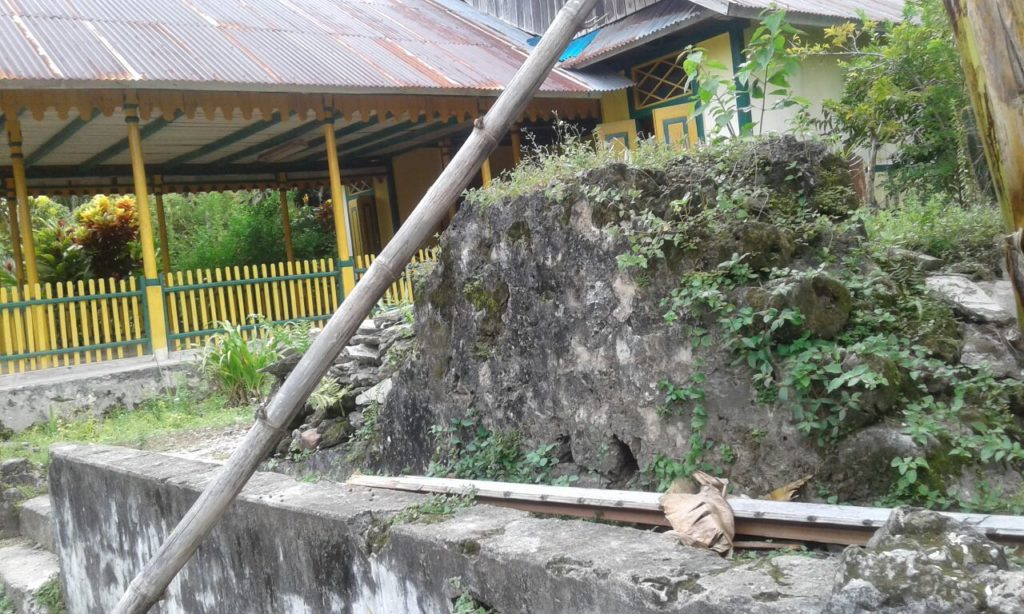 “Bukan!” sigap Pak Hamid membalas. Ia menunjuk halaman luas di seberang masjid. “Di sana, masjid tertua kami pernah berdiri namun sayang sekali pada tahun 1901, masjid itu terbakar. Apakah karena ketidaksengajaan atau karena ada campur tangan Belanda, kami tak tahu.” Oh, awalnya saya pikir itu adalah halaman baileo, ternyata bekas masjid. Kemudian laki-laki berkopiah itu menuju ke sebuah puing bangunan di dekat salah satu meriam. “Ini adalah pondasinya.” Saya mengangguk-angguk seraya memerhatikan seonggok beton di dekat Pak Hamid itu. Ketika saya menanyakan kapan masjid tua itu dibangun, ia hanya tersenyum lalu mengggeleng.