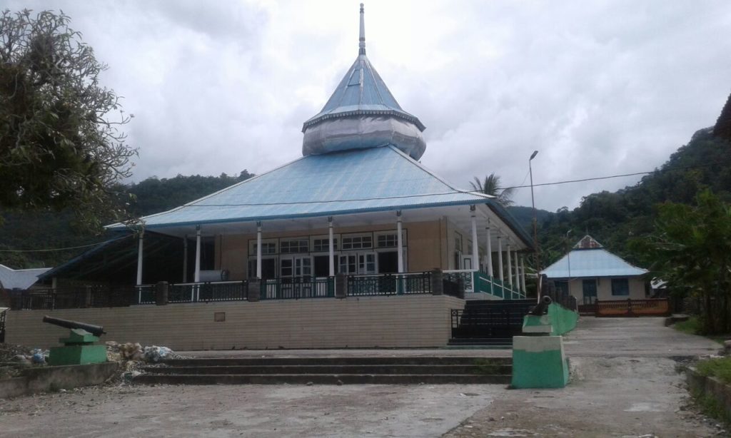 “Bukan!” sigap Pak Hamid membalas. Ia menunjuk halaman luas di seberang masjid. “Di sana, masjid tertua kami pernah berdiri namun sayang sekali pada tahun 1901, masjid itu terbakar. Apakah karena ketidaksengajaan atau karena ada campur tangan Belanda, kami tak tahu.” Oh, awalnya saya pikir itu adalah halaman baileo, ternyata bekas masjid. Kemudian laki-laki berkopiah itu menuju ke sebuah puing bangunan di dekat salah satu meriam. “Ini adalah pondasinya.” Saya mengangguk-angguk seraya memerhatikan seonggok beton di dekat Pak Hamid itu. Ketika saya menanyakan kapan masjid tua itu dibangun, ia hanya tersenyum lalu mengggeleng.
