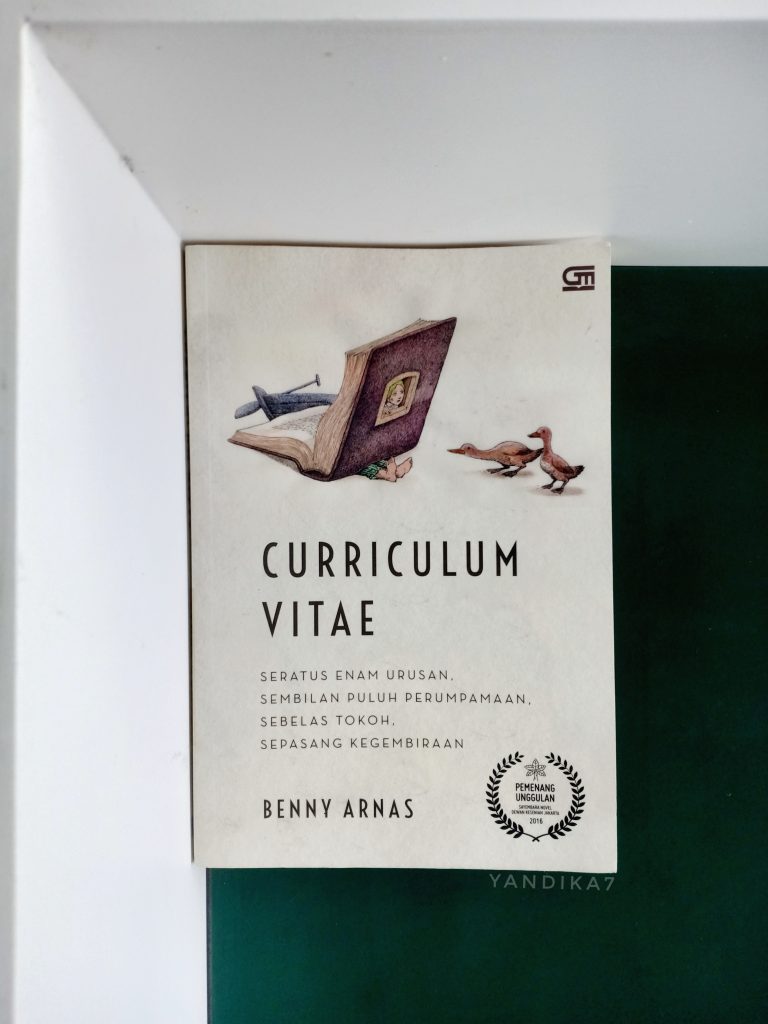 Yeay, buku ini aku dapatkan langsung dari penulisnya: Bang Benny Arnas plus tanda tangannya. Sebelumnya, aku ucapkan ‘terima kasih’ atas hadiah buku yang diberikan ini, Bang. Dari beberapa buku yang belum aku punya (karya beliau), Bang Benny merekomendasikan bukunya yang ini untukku. Maha karya novel yang telah menorehkan prestasi ini menjadi suguhan nikmat-nan-renyah di sela-sela rutinitasku. Ya, Curriculum Vitae adalah Pemenang Unggulan dalam Sayembara Novel Dewan Kesenian Jakarta, 2016.