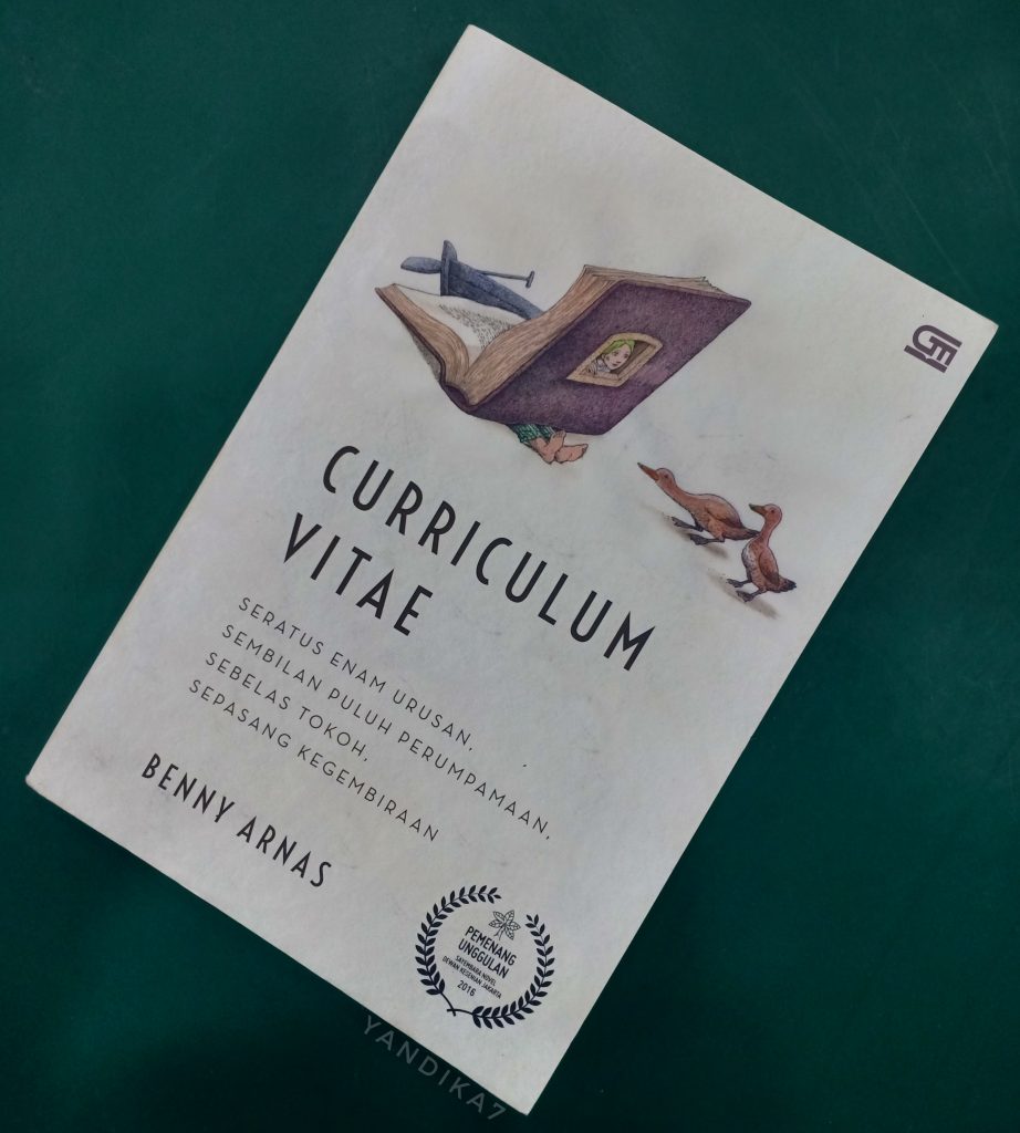 Yeay, buku ini aku dapatkan langsung dari penulisnya: Bang Benny Arnas plus tanda tangannya. Sebelumnya, aku ucapkan ‘terima kasih’ atas hadiah buku yang diberikan ini, Bang. Dari beberapa buku yang belum aku punya (karya beliau), Bang Benny merekomendasikan bukunya yang ini untukku. Maha karya novel yang telah menorehkan prestasi ini menjadi suguhan nikmat-nan-renyah di sela-sela rutinitasku. Ya, Curriculum Vitae adalah Pemenang Unggulan dalam Sayembara Novel Dewan Kesenian Jakarta, 2016.