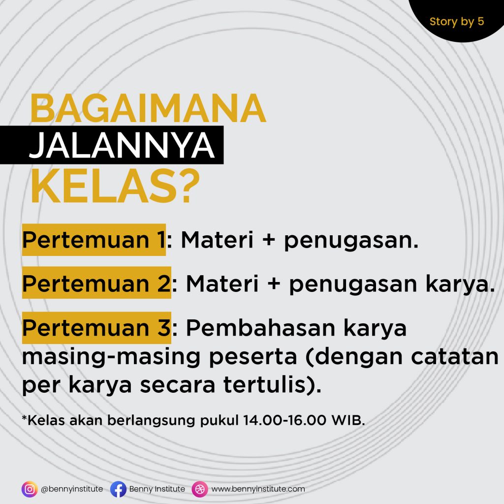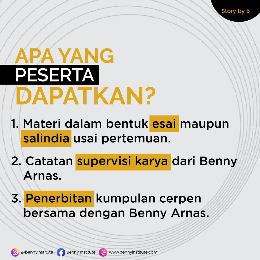 Kelas Cerpen ala Benny Arnas akan menggodok kalian yang tertarik menulis cerpen, karena pada kelas ini, Bang Benny akan mengajarkan metode menulis praktis berbasis formula yang ia terapkan pada ratusan cerpennya yang dimuat berbagai media massa dan memenangkan sejumlah penghargaan.