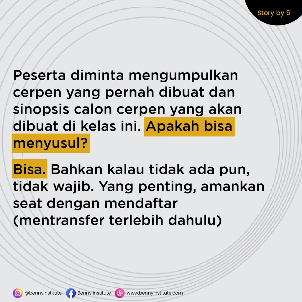 Murah kan! Dengan harga segitu, kalian akan mendapatkan semua hal di atas dan tentunya satu eksemplar buku hasil karya kalian bersama Bang Benny (𝐬𝐞𝐦𝐮𝐚 𝐜𝐞𝐫𝐩𝐞𝐧 𝐝𝐢𝐛𝐮𝐤𝐮𝐤𝐚𝐧).